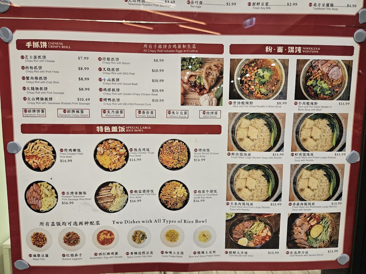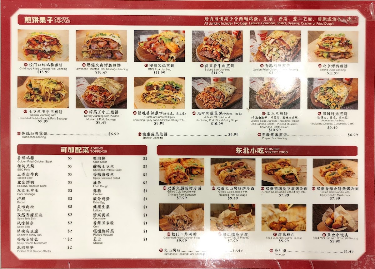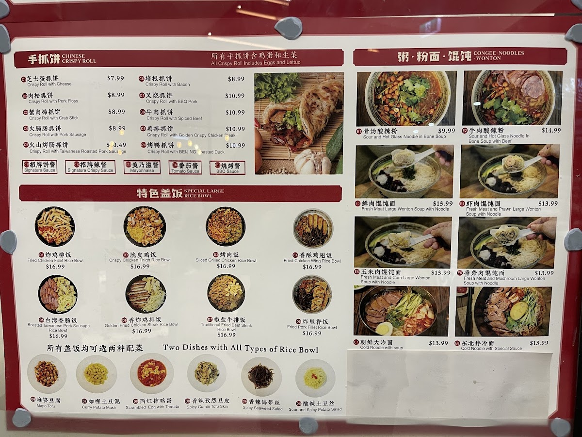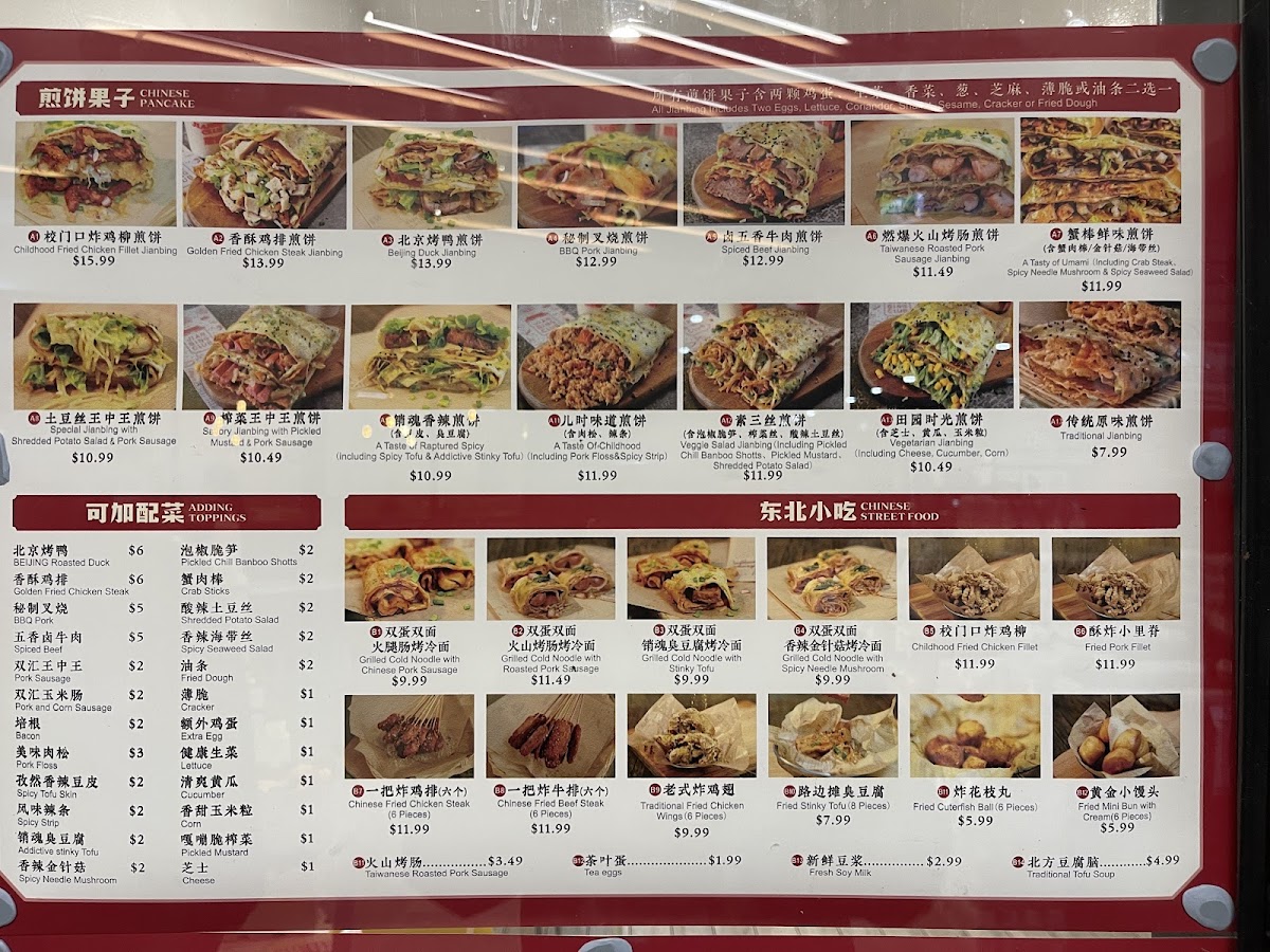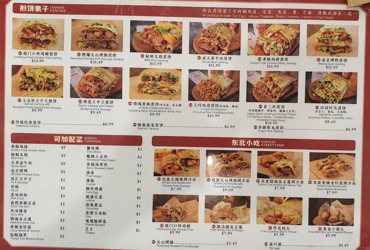 The menu at Jian Bing Club 煎饼小吃部 offers a diverse array of flavorful dishes, with a focus on traditional Chinese street food and Taiwanese specialties. Among the standout items are their signature Jianbing varieties, including the Classic Jianbing and A Taste of Childhood, alongside creative options like the BBQ Pork Jianbing and Roast Beef Jianbing. For something heartier, the Fried Chicken Fillet Rice Bowl and Taiwanese Roasted Sausage Rice Bowl are popular choices, offering a satisfying balance of protein and rice. The Chinese Crispy Rolls bring a delightful crunch, with fillings ranging from Beijing Duck to Pork Floss. Grilled cold noodles are also a highlight, with options like Grilled Cold Noodle with Sausage and the more adventurous Grilled Cold Noodles with Stinky Tofu. If you're craving street food, the Childhood Fried Chicken Fillet and Fried Cutterfish Balls (8 Pieces) are sure to impress. For smaller bites, the Chinese Tea Egg and Spicy Seaweed Salad make for perfect side dishes. The menu also offers a selection of Noodles Wonton options such as Hot & Sour Glass Noodles in Bone Soup with Beef and Prawn and Pork Wonton and Noodle Soup. Wash it all down with refreshing drinks like Soy Milk or the sweet Jane's Lychee. For those looking for a complete meal experience, the Package Series combines dishes like Special Jianbing with Shredded Potato Salad and Pork Sausage with sides like Tea Egg and Traditional Tofu Pudding, creating a fulfilling and flavorful dining experience.